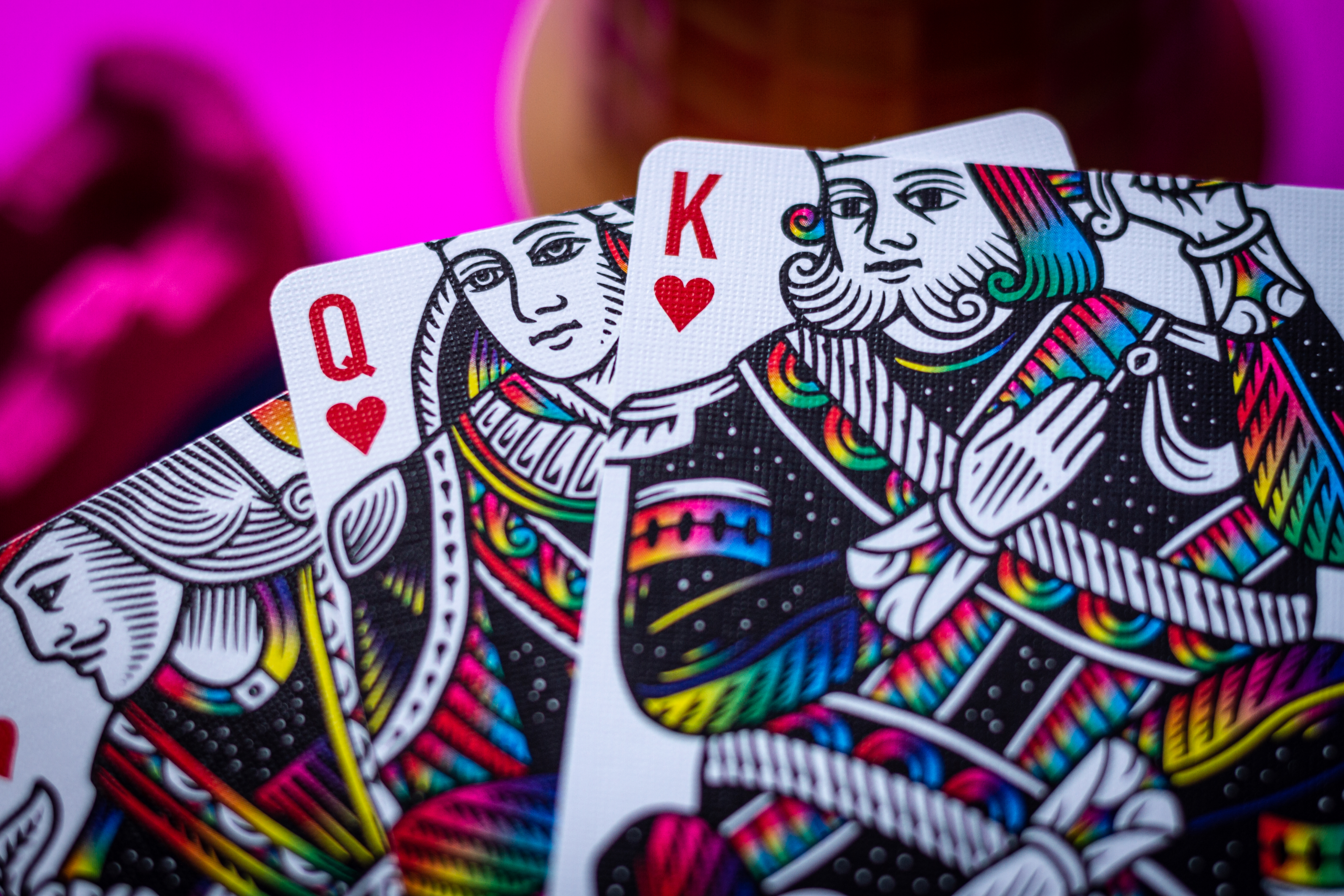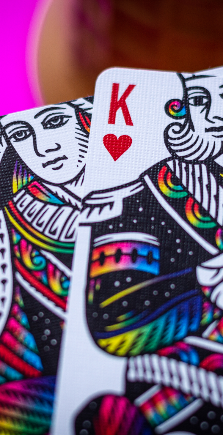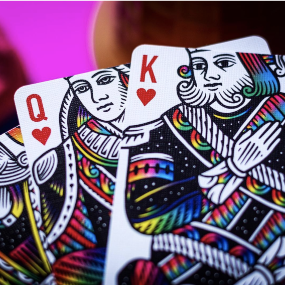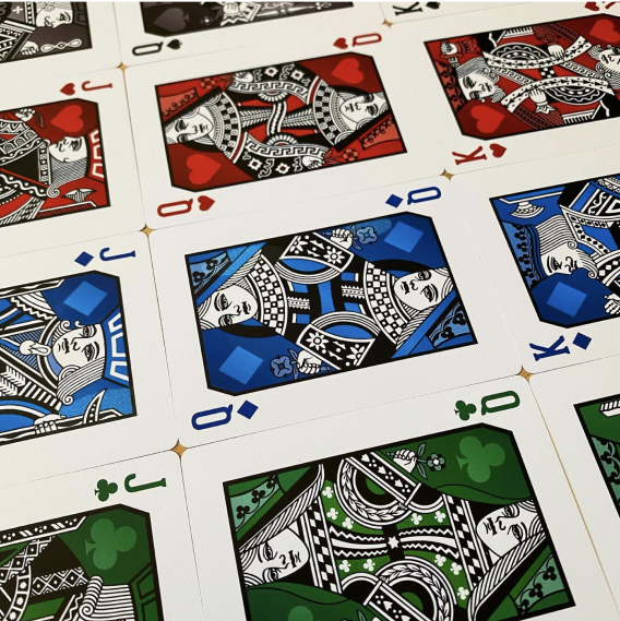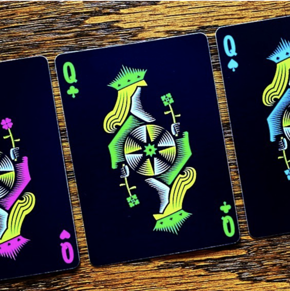 I found one of these decks a few days ago and I’m in love! The design is so beautiful, the back reminds me of Harley Quinn (haha), and the faces, completely custom, are minimalistic and reminiscent of classic playing cards (wish the court cards where easier to read though). An amazing deck all around.