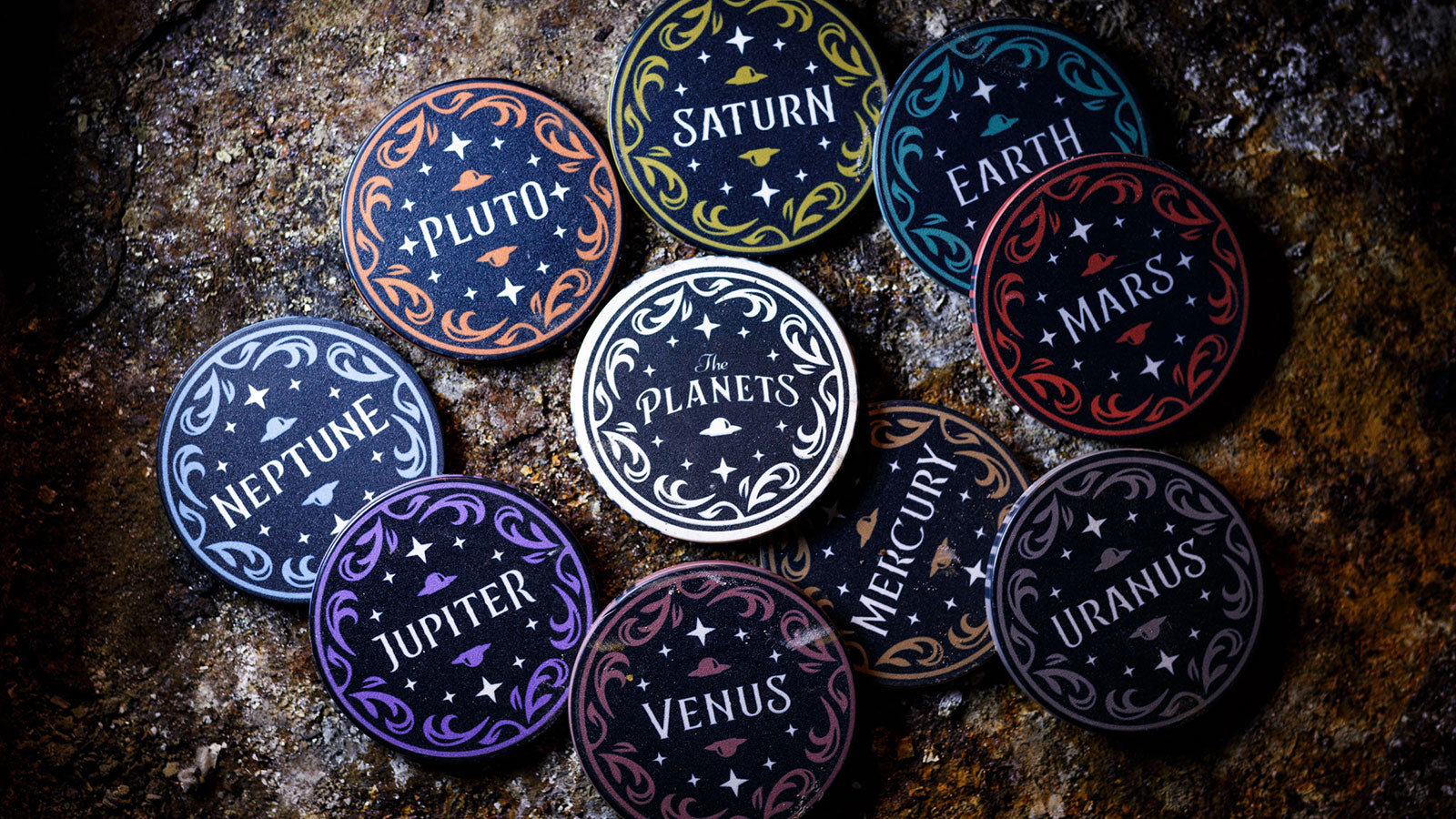 These beautifully designed poker chips were created alongside our Planets playing cards by Srdjan Vidakovic and feature the 8 planets + pluto + a tenth bonus chip design (10 total chip colorways).