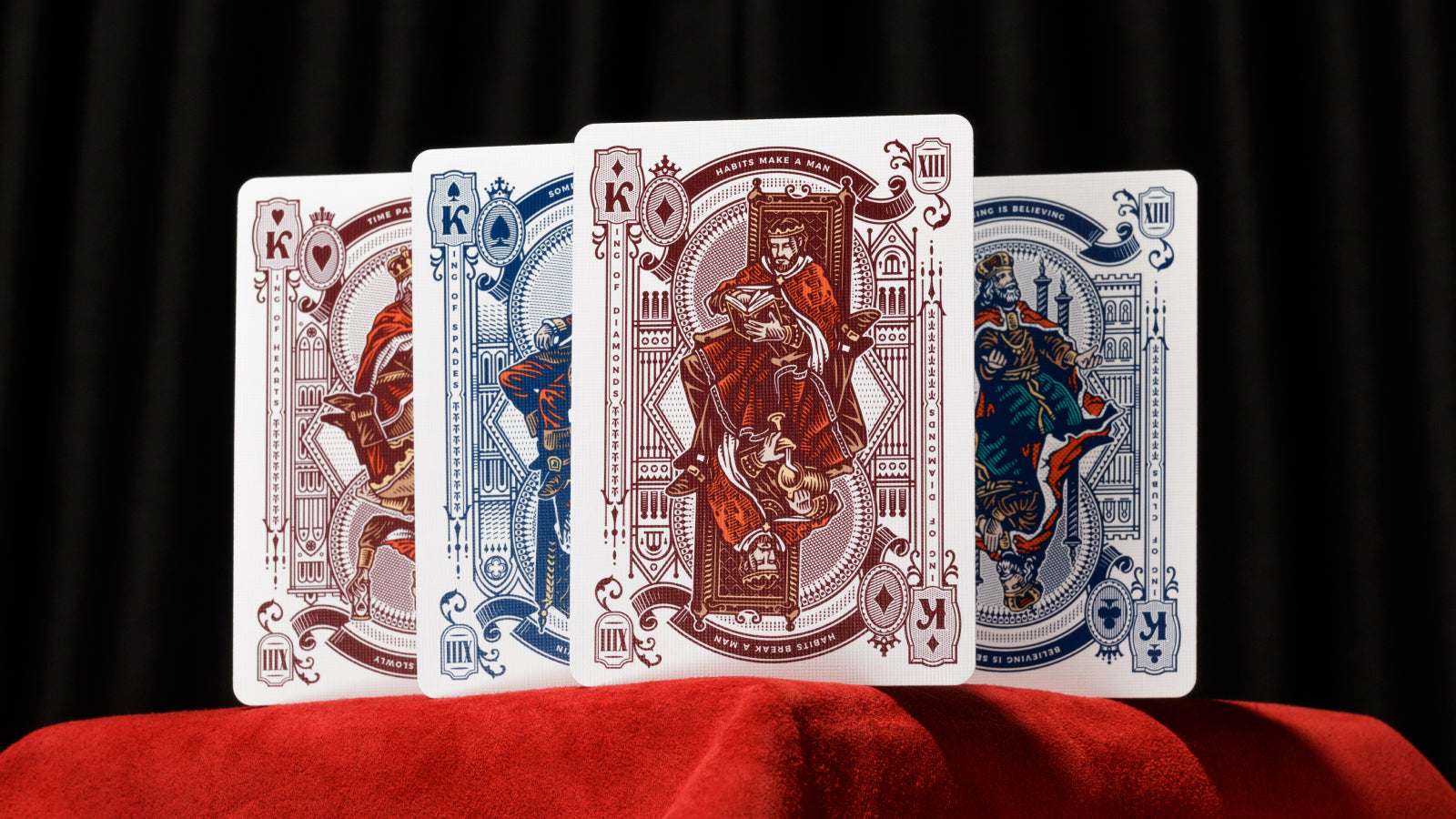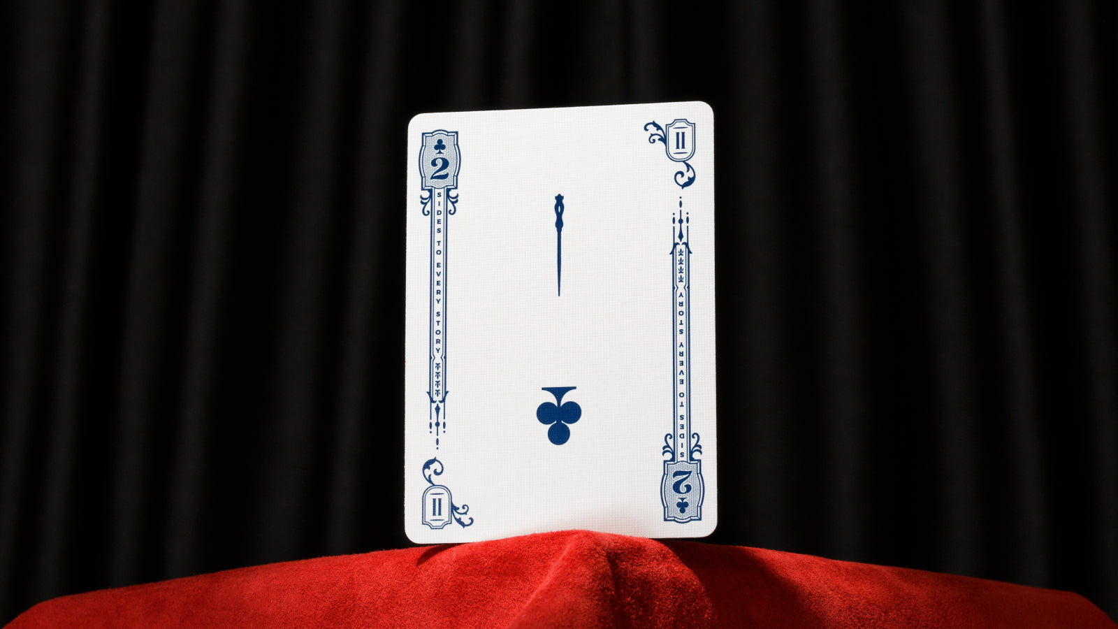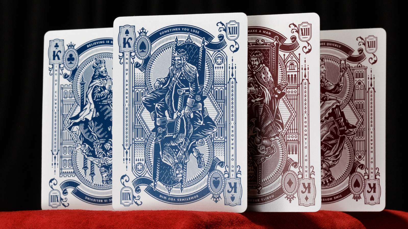 Housed in a deep blue tuck with gold and blue foil accents, this version showcases full-color court cards printed in pantone inks. A 2,500-deck run, produced by USPCC.