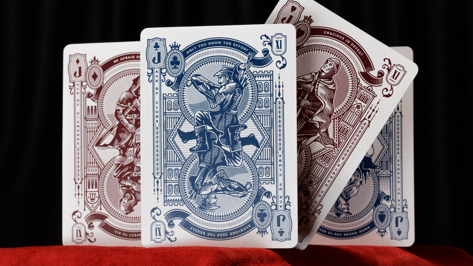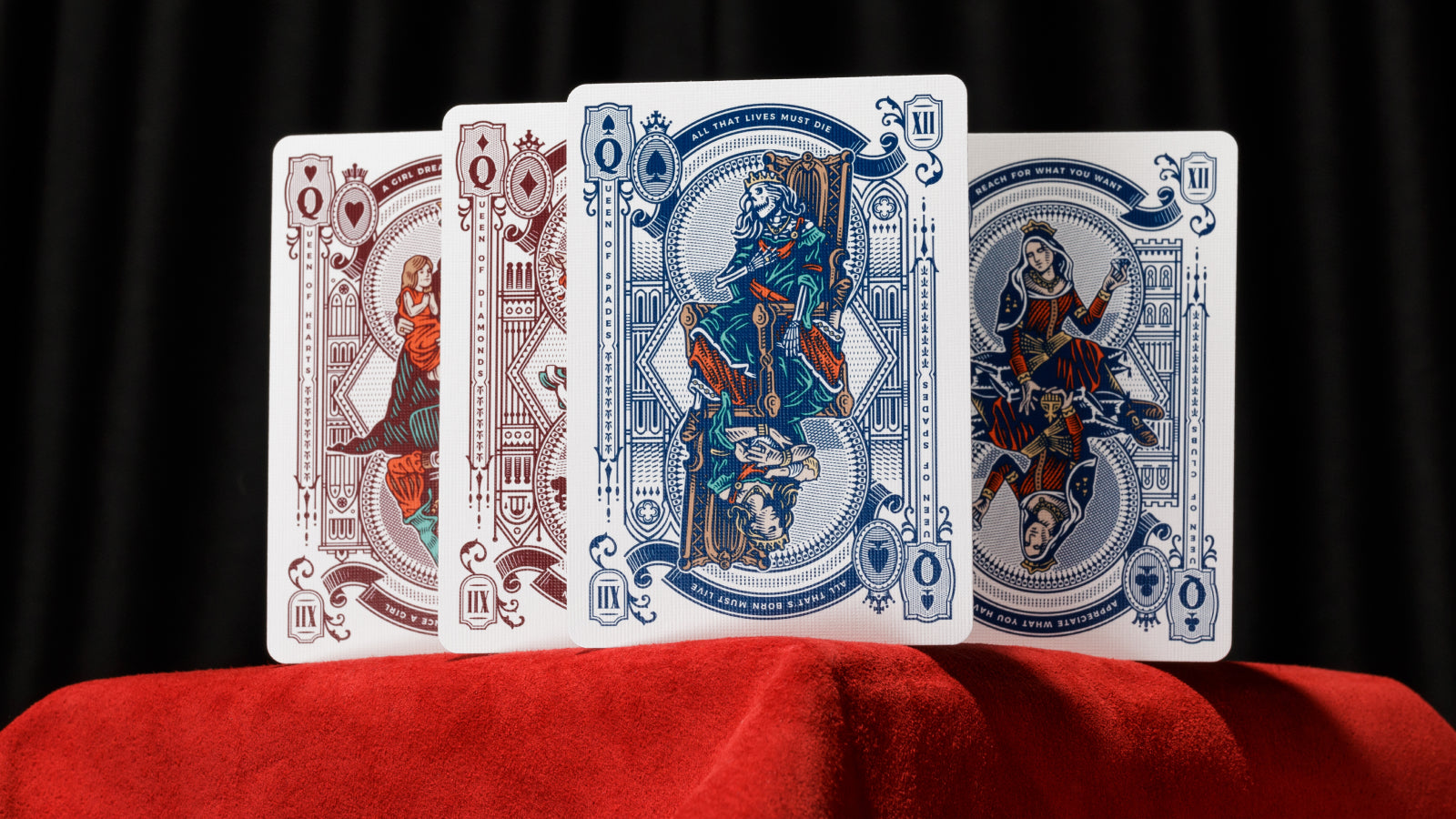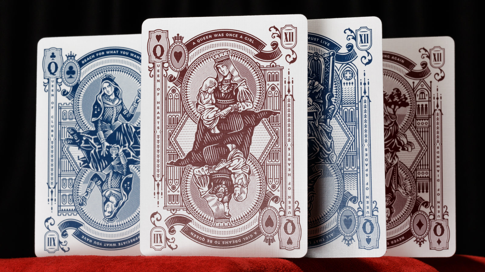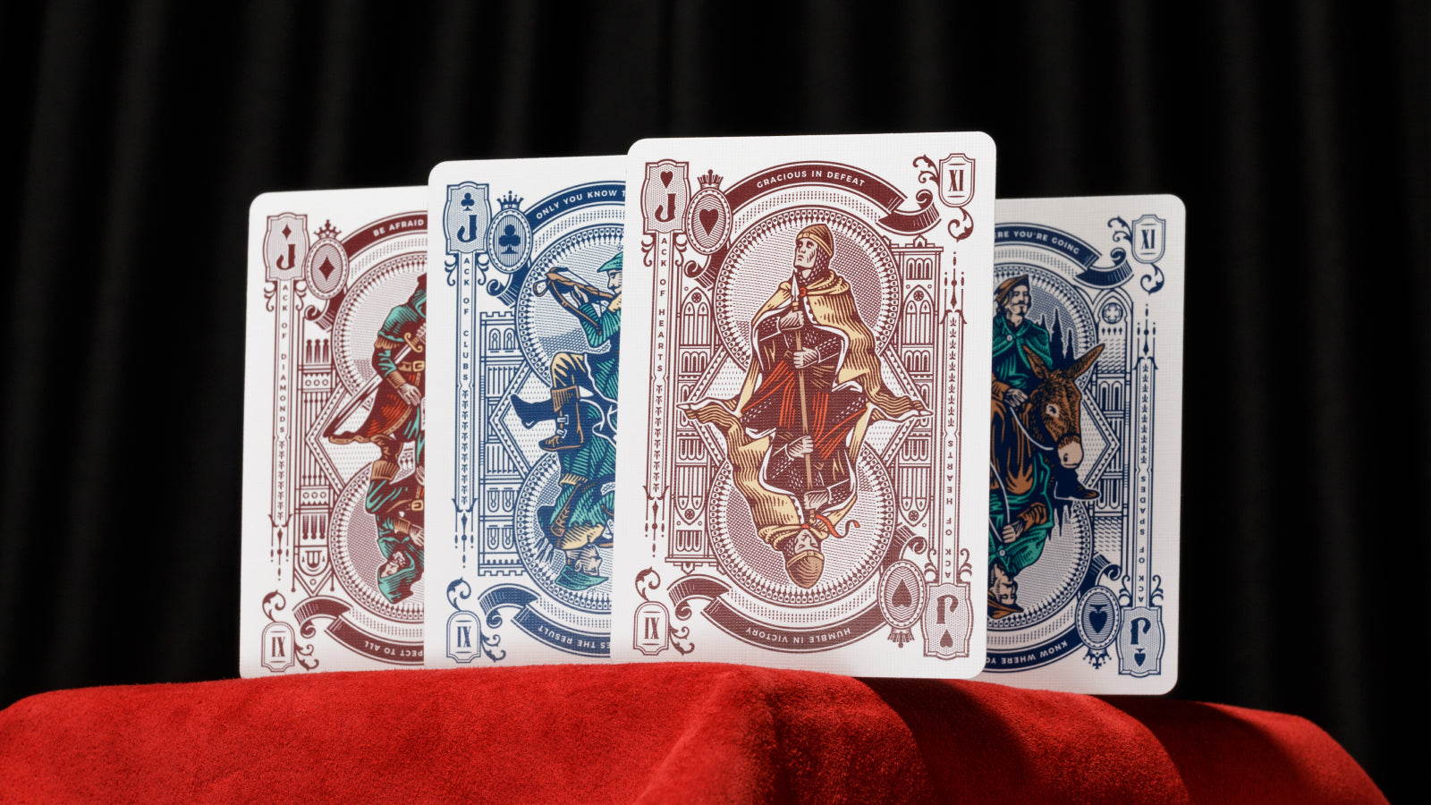 Housed in a deep blue tuck with gold and blue foil accents, this version showcases full-color court cards printed in pantone inks. A 2,500-deck run, produced by USPCC.